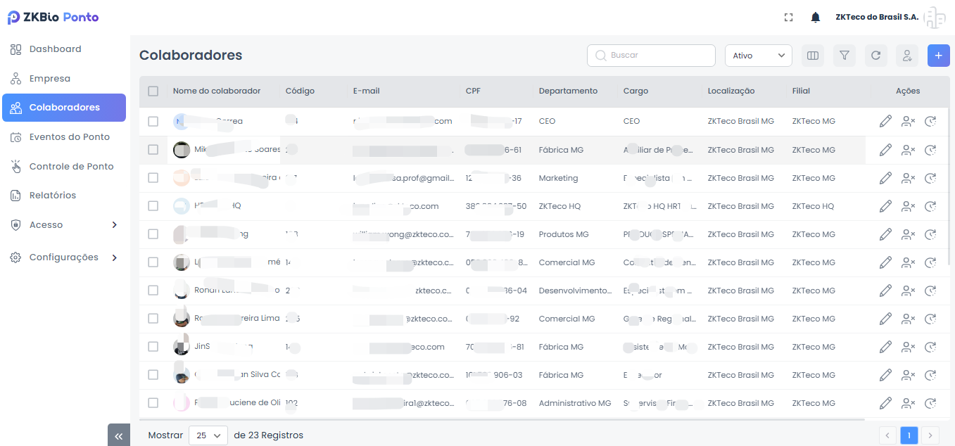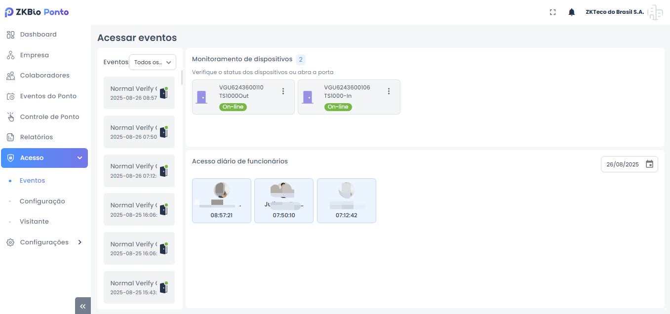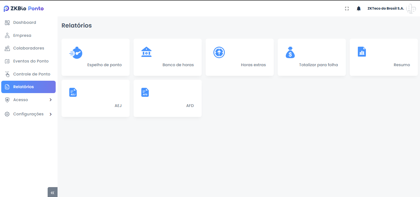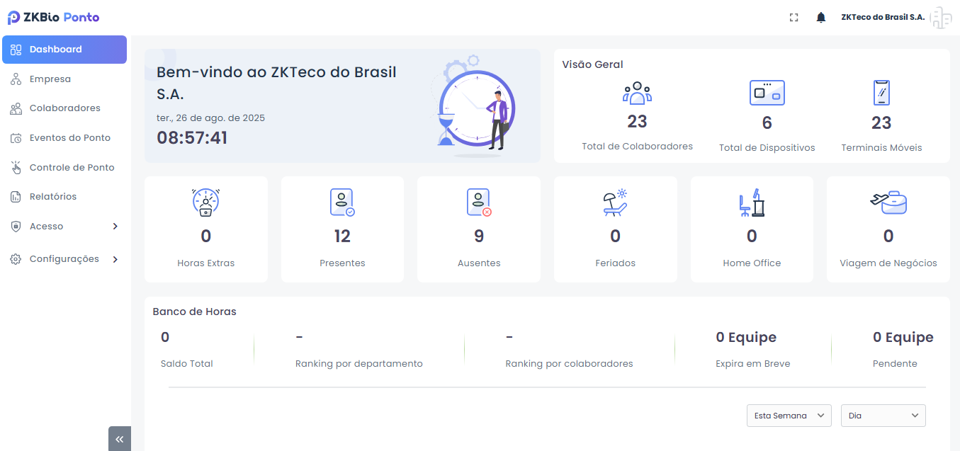ZKBio Ponto é o software da ZKTeco para gestão de ponto eletrônico. Centraliza a coleta das marcações dos relógios, o tratamento automático de jornadas (atrasos, faltas, horas extras, banco de horas, adicional noturno), fluxo de justificativas/aprovação e a emissão do espelho de ponto. Oferece dashboards, relatórios exportáveis (PDF/Excel).